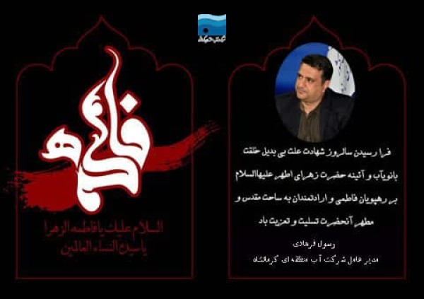اینجانب فرارسیدن سالروز شهادت اسوه زنان عالم، حضرت فاطمه زهرا (سلام الله علیها) را به محضر حضرت ولی عصر (عجل الله تعالی فرجه الشریف) ، مقام معظم رهبری (مدظله العالی)، رهروان راستین امامت و ولایت و کارکنان محترم شرکت آب منطقه ای کرمانشاه تسلیت عرض نموده و از خداوند متعال برای همگان عزت و سربلندی روز افزون و تداوم راه وسیره آن حضرت را خواستارم .