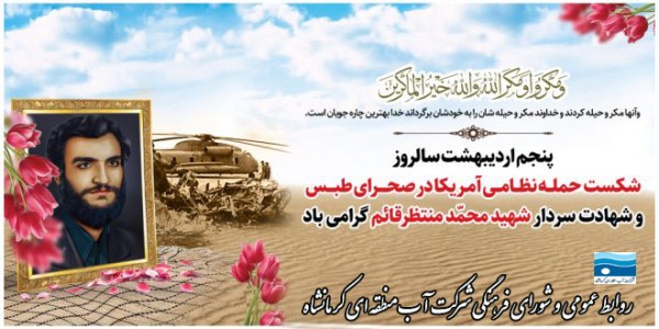 روابط عمومی شرکت آب منطقه ای کرمانشاه در بیانیه‌ای با گرامیداشت پنجم اردیبهشت‌ماه سالروز شکست تجاوز نظامی آمریکا به طبس در سال ۱۳۵۹،هوشمندی برابر ترفندهای جبهه دشمنان به ویژه آمریکای مکار را نیاز همیشگی کشور و عامل ناامیدی نظام سلطه و صهیونیست دانست.