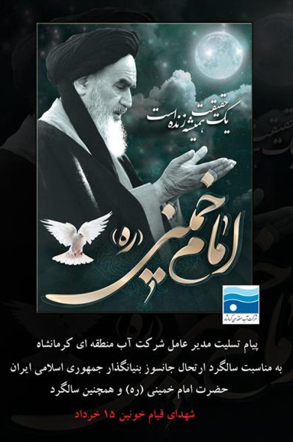 اینجانب ضمن ادای احترام به روح ملکوتی حضرت امام خمینی (ره) و گرامیداشت یاد و خاطره شهدای گرانقدر قیام پانزده خرداد، سی و پنجمین سالروز رحلت حضرت امام خمینی (ره) را به پیشگاه حضرت ولی عصر (عج) و نایب بر حقش مقام معظم رهبری(مد ظله العالی) ، کارکنان سخت کوش صنعت آب و به ویژه تلاشگران ولایت مدار شرکت آب منطقه ای کرمانشاه تسلیت عرض نموده ؛ امید که  به فضل خداوند در پاسداری از آرمان های والای بنیانگذار جمهوری اسلامی و پیروی از فرامین رهبر فرزانه انقلاب برای پیشرفت و اعتلای کشور بیش از پیش کشور تلاش نمائیم .
