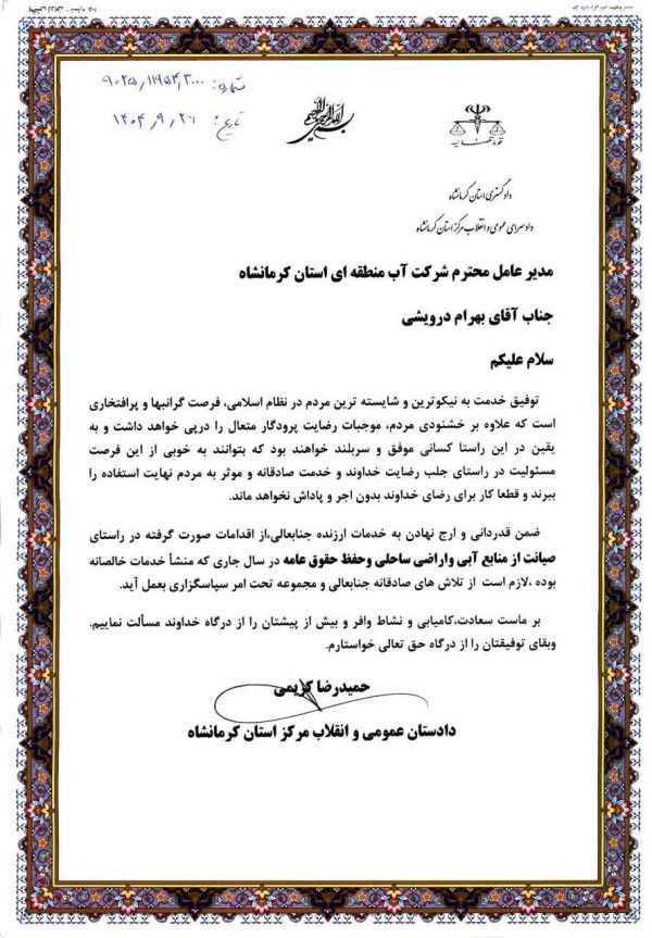 به گزارش روابط عمومی شرکت آب منطقهای کرمانشاه، طی مراسمی رسمی با حضور دادستان کل انقلاب اسلامی استان کرمانشاه، معاونان وی و بهرام درویشی، مدیرعامل شرکت آب منطقهای کرمانشاه، از عملکرد این شرکت در صیانت از حقوق بیتالمال و حفاظت از حقوق عمومی تقدیر شد.